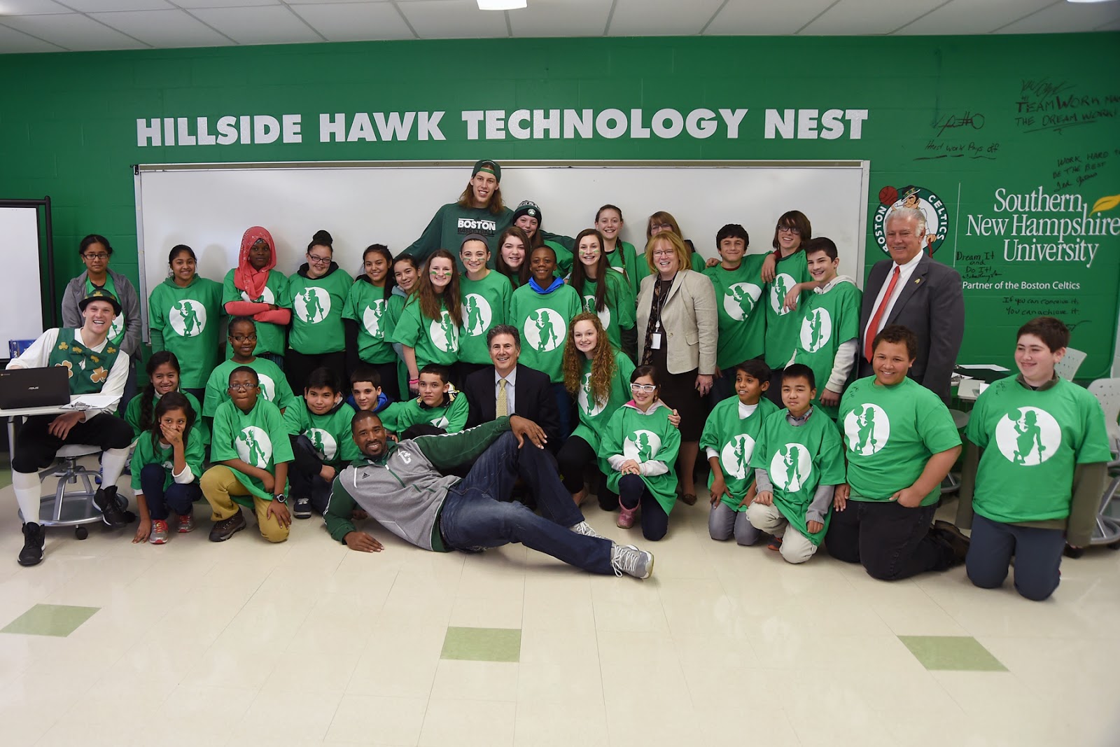 Boston Celtics forward/center Kelly Olynyk, former player Leon Powe, mascot “Lucky” the Leprechaun, along with Southern New Hampshire University vice president of marketing and student recruitment Gregg Mazzola, superintendent of schools Debra Livingston, and Mayor Ted Gatsas, were on hand today with students of Hillside Middle School to unveil a state-of-the art technology lab.