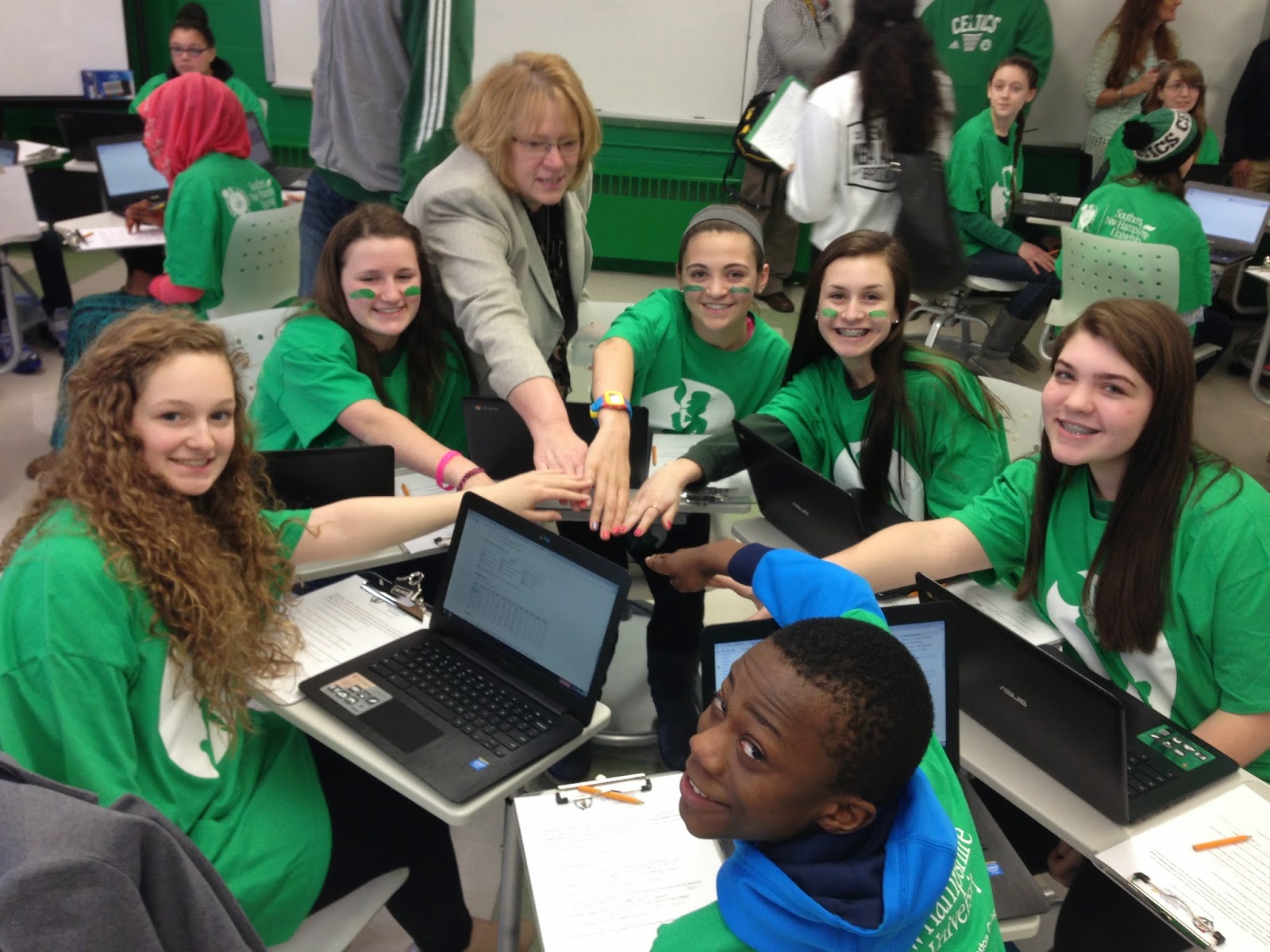 During the event, students used their new computers to complete an online scavenger hunt, where they researched facts about the Celtics, SNHU, Leon Powe, Boston and Manchester. Later, the students and their special guests joined the rest of the school community in the gym for a pep rally.