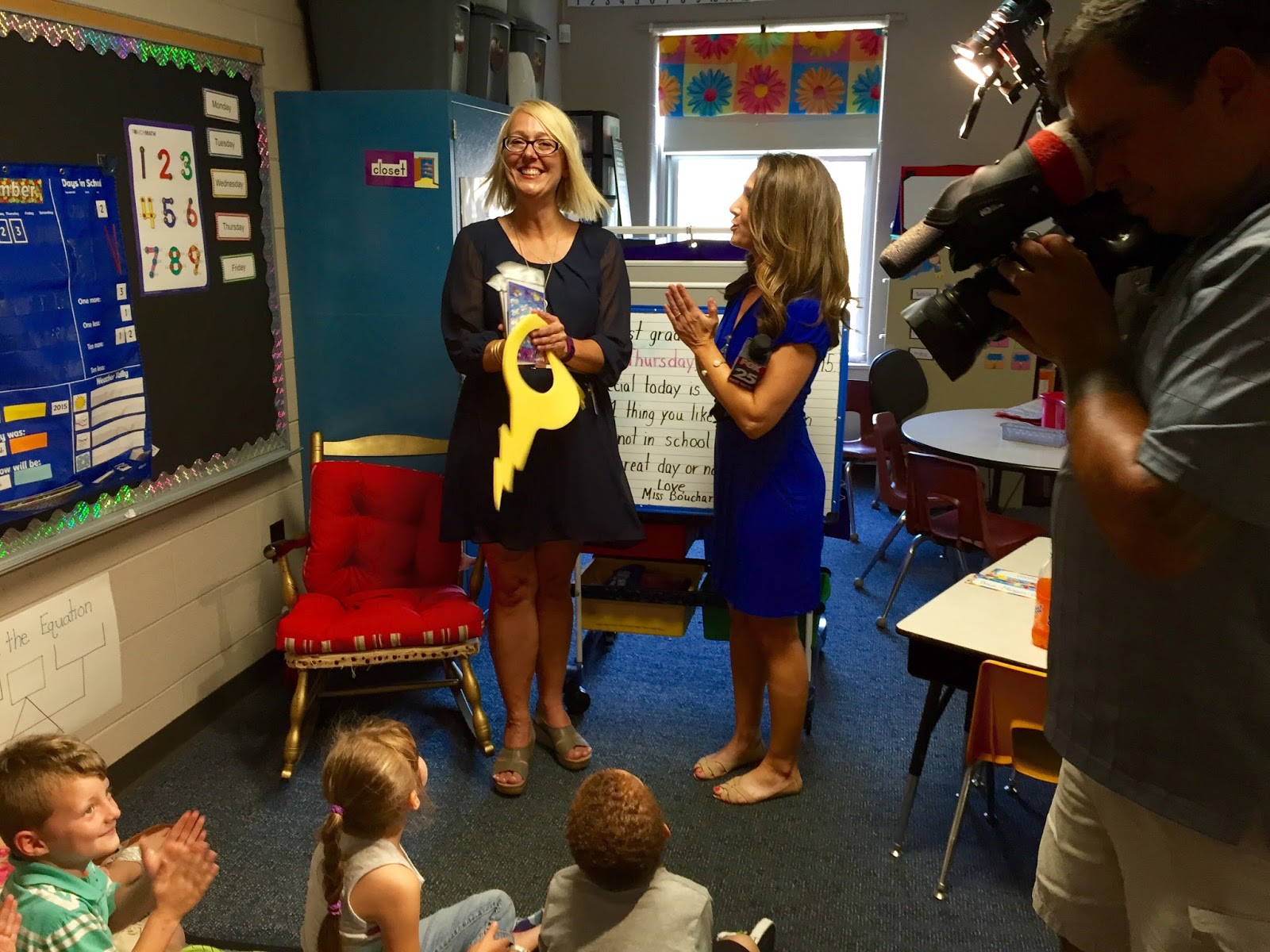 FOX25 Morning News meteorologist Shiri Spear visited Ms. Bouchard’s class to tell her about the TV station’s support, From now until September 11, FOX25 is surprising teachers who have posted their needs through DonorsChoose.