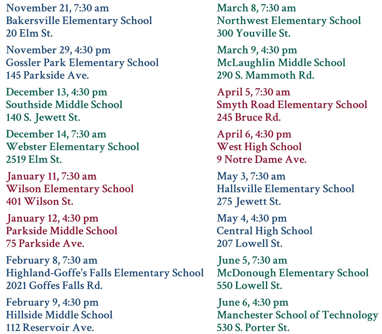 A morning and afternoon session will be hosted each month at a different school. All are welcome, no matter where in Manchester you live, which school you work in, or where your children go to school. Choose the date, time, and location that is most convenient for you, or feel free to attend more than one session before the end of the school year.