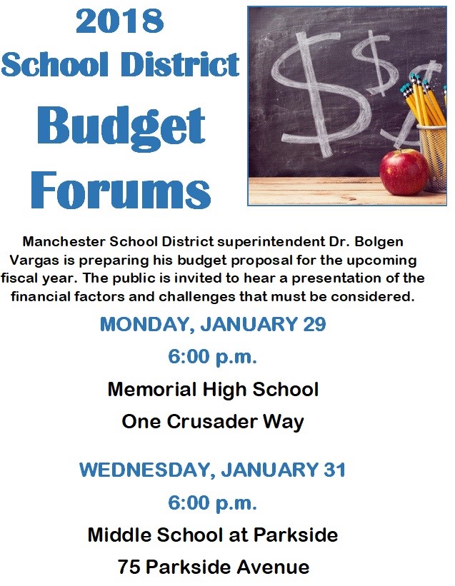 Uncategorized Dr. Vargas to host public forums for budget presentation Date: January 24, 2018Author: manchesterschooldistrict 0 Comments Share this: Share on X (Opens in new window) X Share on Facebook (Opens in new window) Facebook Like Loading... Related