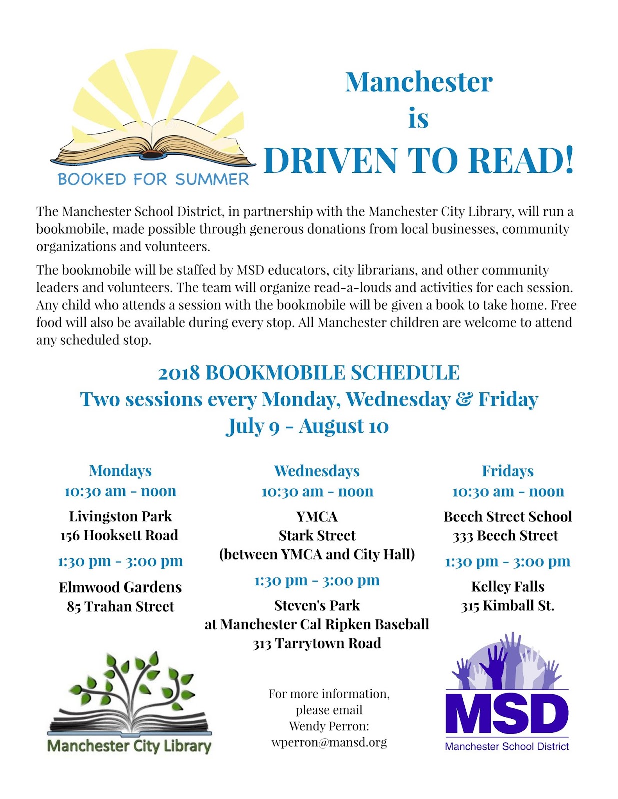 We’re excited for July 9, when the new Manchester bookmobile start its drive through the city, making stops at various public locations.