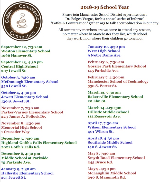 Uncategorized 2018/19 Coffee & Conversation schedule Date: September 6, 2018Author: manchesterschooldistrict 0 Comments Share this: Share on X (Opens in new window) X Share on Facebook (Opens in new window) Facebook Like Loading... Related