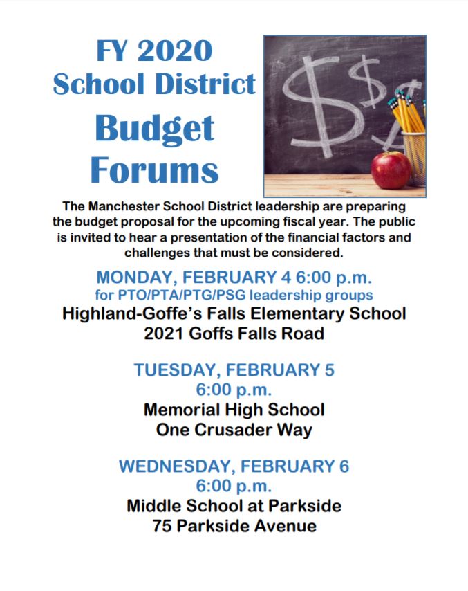 administration, Events Community Budget Forums for FY 2020 Date: January 17, 2019Author: manchesterschooldistrict 0 Comments Share this: Share on X (Opens in new window) X Share on Facebook (Opens in new window) Facebook Like Loading... Related