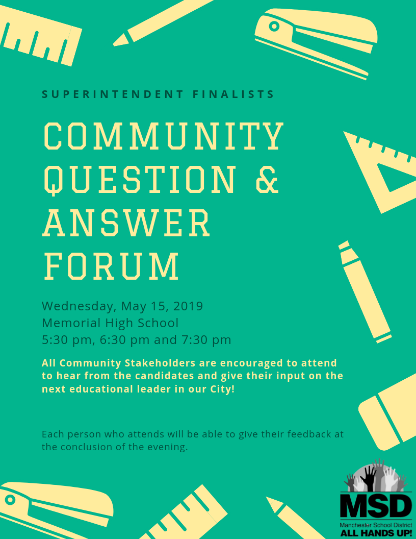administration, community, Events, Uncategorized Community Question & Answer Forum with the Three Finalists for Superintendent Date: April 24, 2019Author: manchesterschooldistrict 0 Comments Share this: Share on X (Opens in new window) X Share on Facebook (Opens in new window) Facebook Like Loading... Related